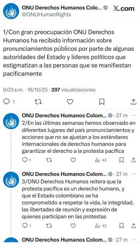 Gün boyunca, İçişleri Bakanı Mario Benedetti ve Santander Valisi Juvenal Díaz, protestoları “suç faaliyetleriyle” ilişkilendirerek damgalayıcı açıklamalarda bulundu. Bu tür açıklamalar, toplulukları yasadışı faaliyetlerle sorumsuzca ilişkilendirerek onları tehlikeye atıyor. Bu tutum, toplumsal protestonun meşru ve barışçıl doğasını göz ardı ediyor ve baskı ile yıldırma ortamını körüklüyor. Bu gelişmeler üzerine, Birleşmiş Milletler İnsan Hakları Ofisi, devlet yetkilileri ve siyasi liderlerin barışçıl göstericileri damgalayan kamu açıklamalarına dair bilgiler aldığını belirten bir bildiri yayımladı. Bildiride, bu durumun temel haklar ve demokrasi açısından ciddi bir tehdit oluşturduğu vurgulandı.